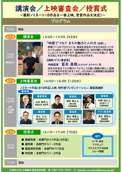 このたび、「四国を元気にする!」をテーマに募集した全95作品の中から、一般の方によるWEB応援投票及び四国情報通信懇談会コンテンツ部会が選出した審査員15名による審査を経て、最終審査(上映審査会)の対象となる18作品が決定しました。