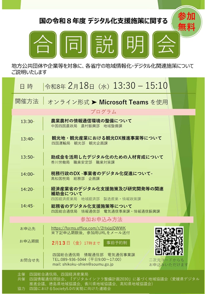 四国総合通信局は、四国経済産業局とともに、「四国におけるSociety5.0の実現に向けた連絡会(※)」の参加機関と協力し、令和8年度に実施を予定している地域情報化・デジタル化関連施策、予算案の内容等に関する説明会を、オンライン(Microsoft Teams)にて開催します。