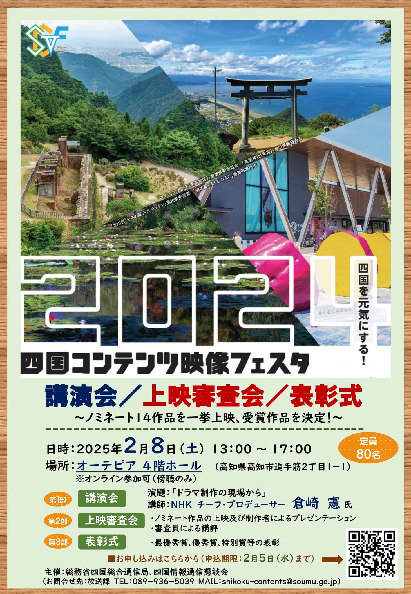 四国情報通信懇談会は、四国総合通信局とともに、四国における映像クリエイターの育成と映像を通じた地域の魅力発信を目的として、「四国コンテンツ映像フェスタ2024」を開催しています。...