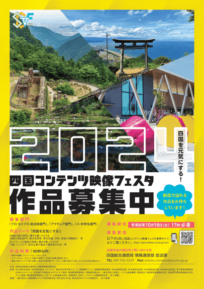 四国情報通信懇談会は、総務省四国総合通信局とともに、「四国コンテンツ映像フェスタ2024」を開催し、令和6年10月16日(水)までの間、「四国を元気にする!」をテーマにデジタル動画コンテンツを募集します。...
