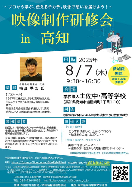 四国情報通信懇談会は四国総合通信局とともに、四国における映像クリエーターの育成と、動画制作を通じた地域の魅力発信を目的として「映像制作研修会in高知」を実施します。 研修会では、「伝える力」を養えるようプロの指導による座学と実践ワークショップを開催します。 ●開催概要 日時:令和7年8月7日(木) 9:30~16:30...
