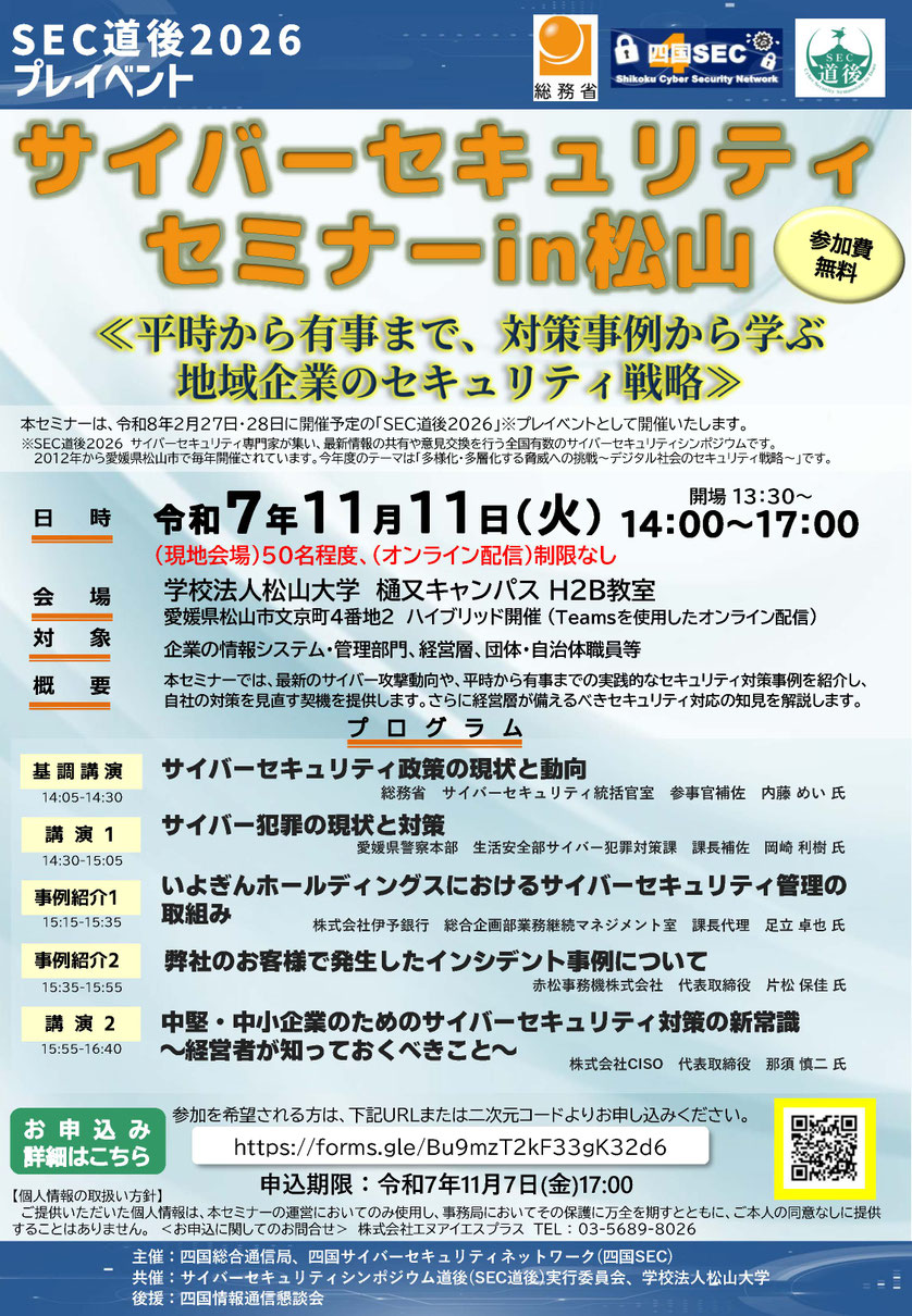 【後援行事】「サイバーセキュリティセミナーin松山」を開催【申込〆:11月7日(金)17時まで】★11月11日(火)開催★