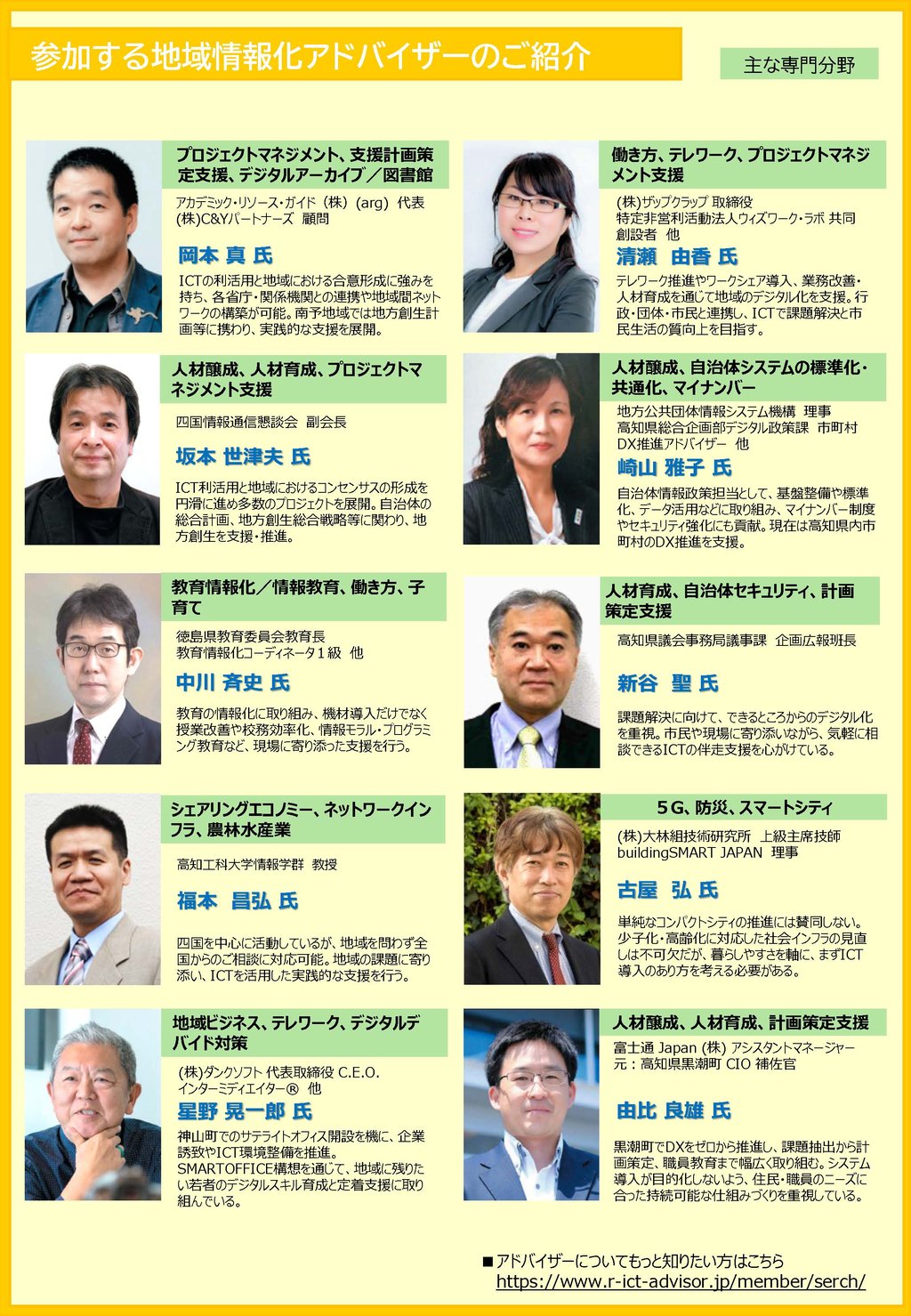 ・地域情報化アドバイザー自己紹介、活動内容紹介(四国を活動基盤とされている9名のアドバイザー)