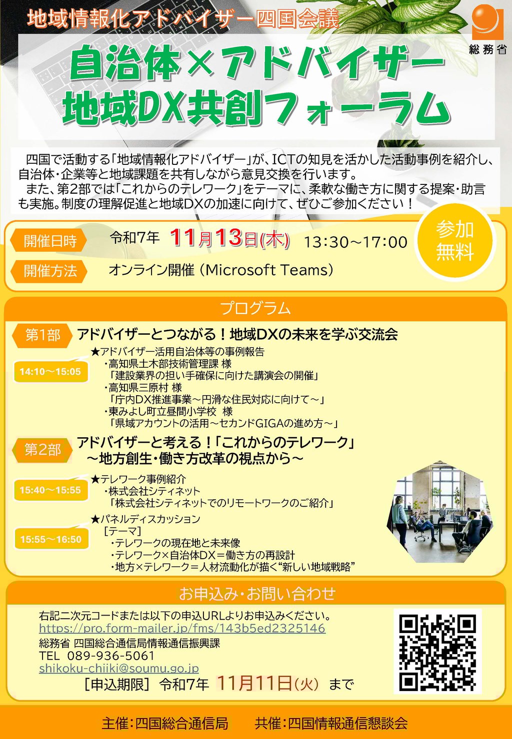 総務省では、地域課題解決に向け、ICT利活用の知見・ノウハウをお持ちの方々を「地域情報化アドバイザー」として委嘱し、自治体等からの要望を受けて派遣しています。このたび、四国で活動する「地域情報化アドバイザー」が、ICTの知見を活かした活動事例を紹介し、自治体・企業等と地域課題を共有しながら意見交換を行います。また、第2部では「これからのテレワーク」をテーマに、柔軟な働き方に関する提案・助言も実施。制度の理解促進と地域DXの加速に向けて、ぜひご参加ください!