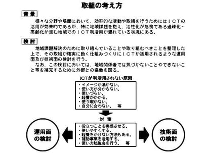 今年度はこの成果を発展する取組として、ICT地域活性化懇談会の提言にも即した形でのICT利活用普及促進活動を、地域課題解決と情報通信インフラの活用に意欲的である地域との協働により実施します。